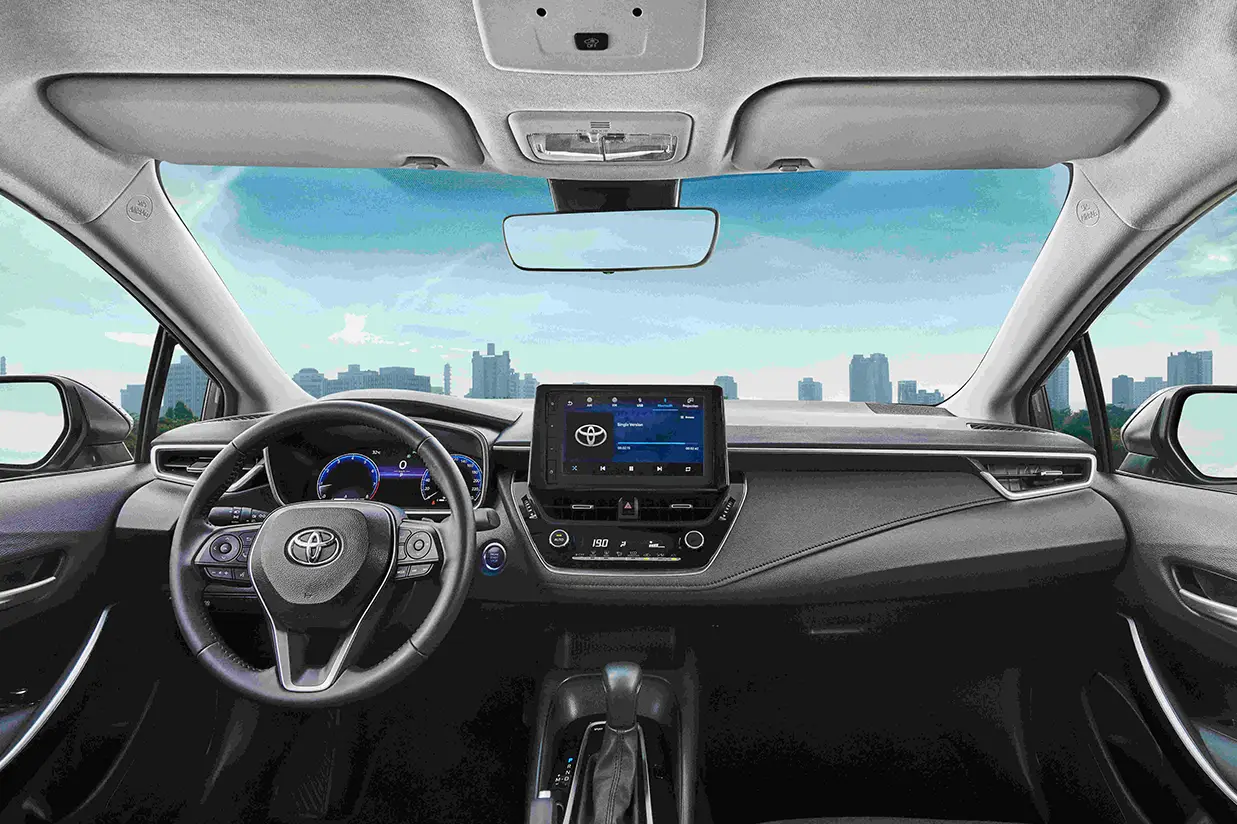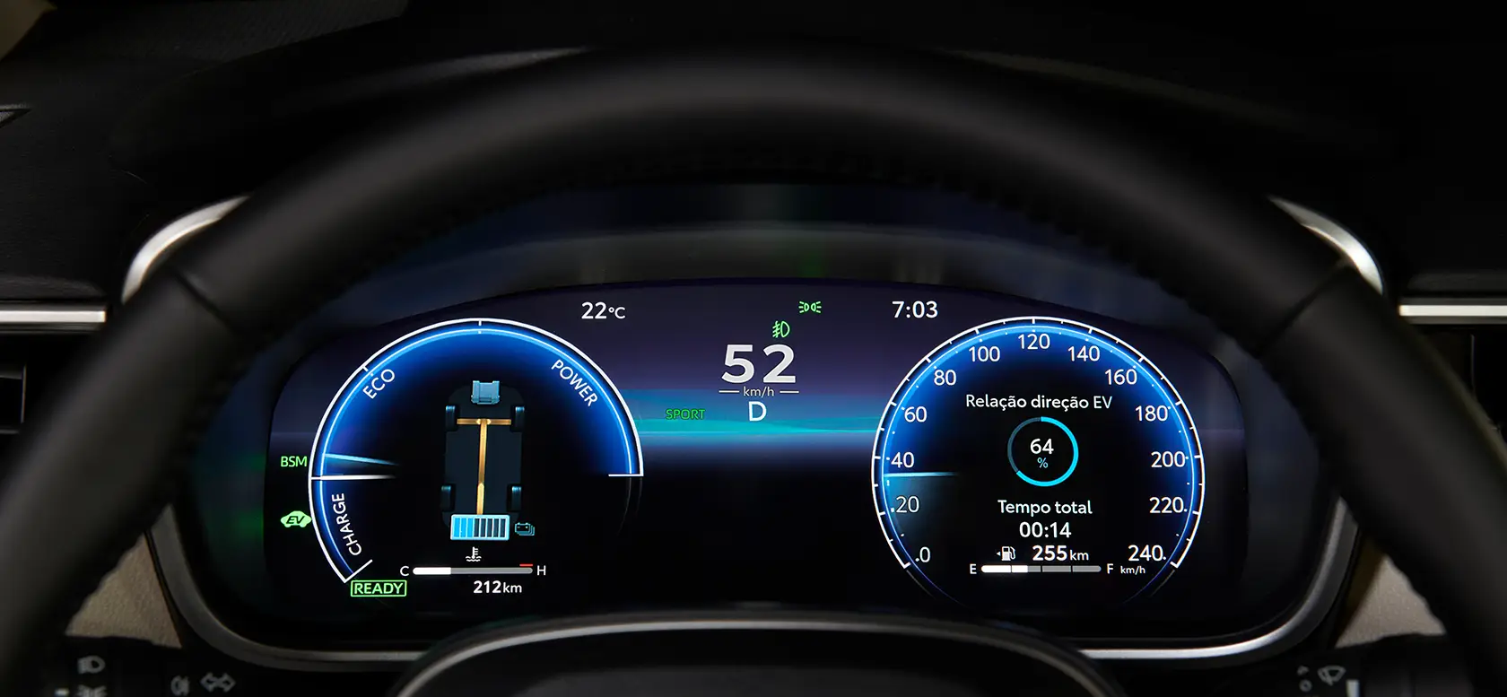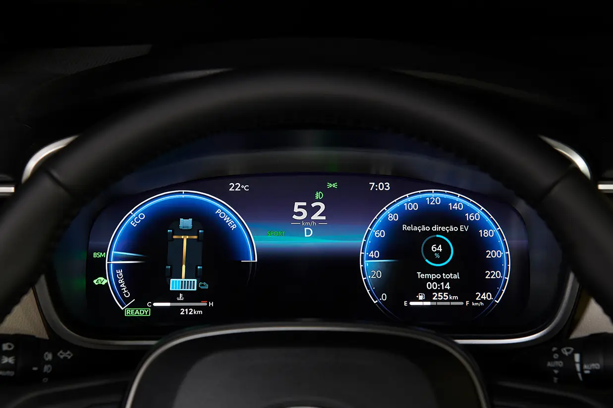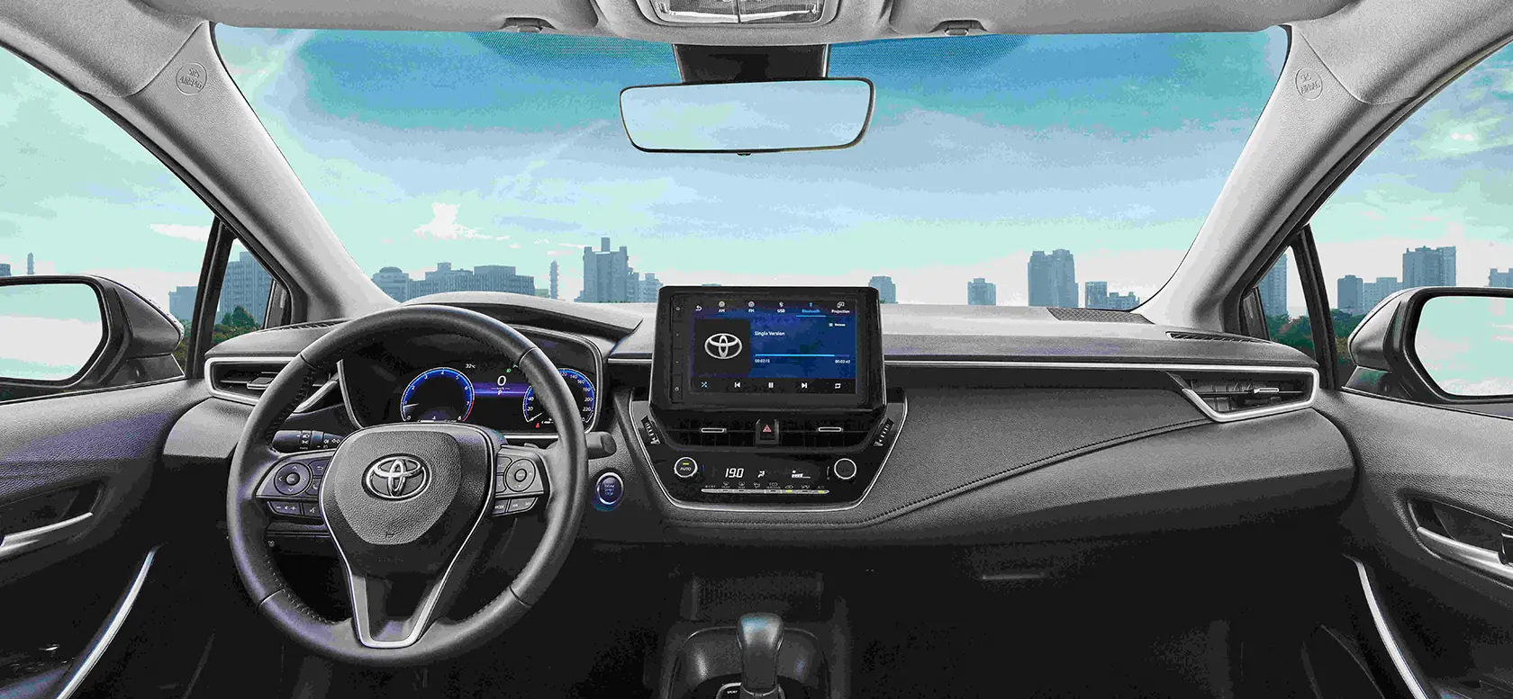 Ar-condicionado digital automático, central multimídia de 9" com conexão Android Auto® e Apple CarPlay®. Painel digital de 7", saída de ar condicionado com duas portas USB-C para passageiros traseiro, volante com controles de áudio e funções TSS⁴ (Toyota Safety Sense).