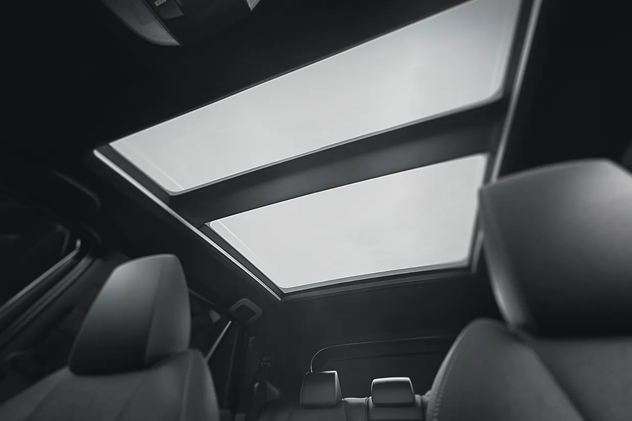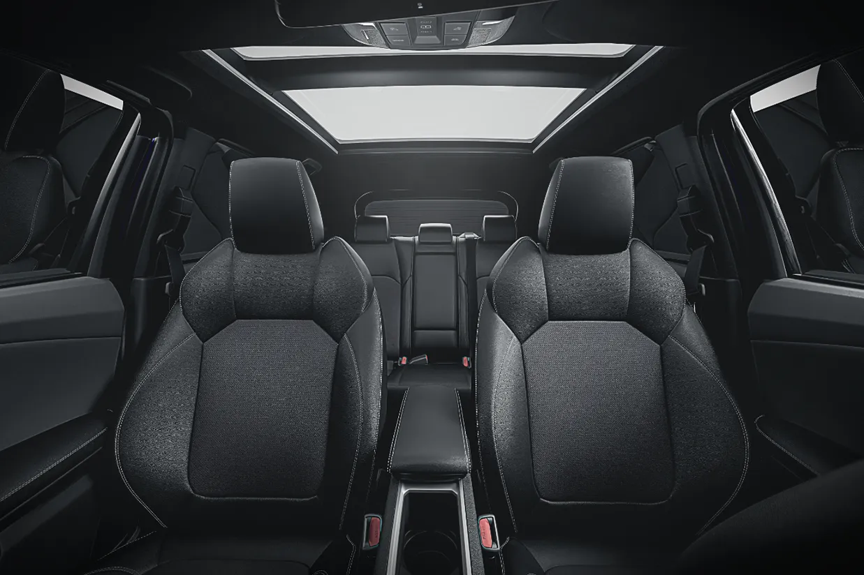 Design que combina robustez e fluidez para uma presença mais marcante, com rodas de 18" de liga leve com acabamento na cor preta, teto panorâmico fixo em vidro e revestimento de costura aparente no painel e portas com acabamento soft touch.